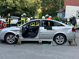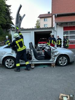 An einem ausgemusterten KFZ konnte realitätsnah die „Patientenorientierte Rettung“ aus einem verunfallten PKW geübt werden. Unter Anleitung und technischer Unterstützung von den Kameraden der Feuerwehr Flieden wurden zunächst Möglichkeiten aufgezeigt welche Maßnahmen zum „sichern“ und „stabilisieren“ sowie zur „Rettung“ eines Patienten ergriffen werden können.