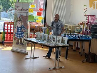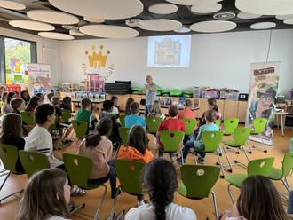 Am 5.7.23 kam der Schriftsteller (Autor) von Herrn Bombelmann in die Aula der Fliedetalschule. Er hieß Wolfgang und konnte seine Stimme sehr gut verstellen. Nachdem die 1. Klassen in der ersten Stunde, die 2. Klassen in der zweiten Stunde und die 3. Klasse in der dritten Stunde ihre Lesungen hatten, kam die 4. Klasse.