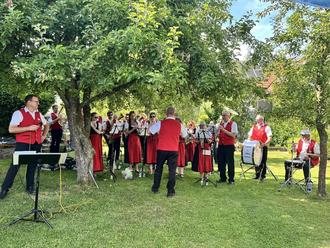 Nach dem Hochzeitsständchen fuhren wir gleich weiter Richtung Schweben. In Bröckls Garten feierte Hilde ihren Geburtstag. Dies war der richtige Rahmen, um das Geburtstagsständchen für Herbert Bröckl, der im November des vergangenen Jahres das 85. Lebensjahr vollendete, nachzuholen. Mit Melodien aus seiner Heimat, dem Egerland, gratulierten „Die Döngesmühler“ Herbert nachträglich zu seinem Jubiläum. Elisa Harengel, Mitglied unseres Vorstandsteams, überreichte ihm passend zur Jahreszeit einen Präsentkorb mit leckeren Grillspezialitäten. Im Anschluss an das Ständchen luden die Jubilare die Musikerinnen und Musiker noch zu einem kleinen Imbiss ein. Dieser Einladung sind wir gerne gefolgt.