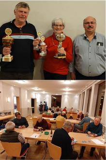 Die Bilder zeigen die beiden Sieger Evi und Georg mit Thomas nach der Pokalübergabe sowie die Spielteilnehmer während des Spielens.
