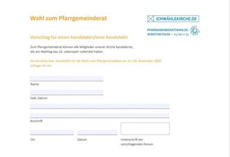 Zum zweiten Mal seit der Neugründung unserer Pfarrei Christkönig wird nun der Pfarrgemeinderat gewählt. Wir suchen Kandidaten, die sich vorstellen können, in einer aktiven Pfarrgemeinde mitzuarbeiten und mitzugestalten. Bitte melden Sie sich gerne bei uns im Pfarrbüro oder nennen Sie uns mit dem hier abgedruckten Formular eine Person, die Sie für geeignet halten. Wir werden dann Kontakt aufnehmen. Vielen Dank für Ihre Mithilfe.