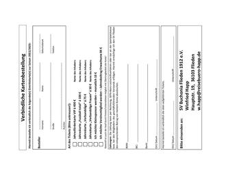 Bitte nutzen Sie den Bestellschein für die gewünschte Karte. Sie erhalten die Karte dann mit Rechnung zugesandt. Sie können den Betrag auch von Ihrem Konto einziehen lassen. Jahres- und VIP-Förderkarten sind nicht übertragbar. Die Karten sind bei Winfried Happ sowie den Mitgliedern des geschäftsführenden Vorstands, bei der Raiffeisenbank (Markus Föller), im Reisebüro Happ und auch an der Sportplatzkasse bei den ersten Heimspielen erhältlich.