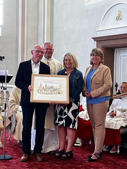Am Ende des Festgottesdienstes dankten ihr Pfarrer Maleja und Stefan Scheich stellvertretend für das ganze Pfarrteam, die Pfarrgemeinde und den Pfarrgemeinderat/Verwaltungsrat. Weiterhin wurde noch das neue Gewand von Fr. Bös gesegnet, welches sie künftig für den Beerdigungsdienst nutzen wird.