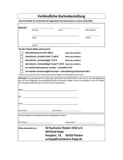 Wir übersenden Ihnen mit diesem Schreiben einen Bestellschein für die gewünschte Karte. Sie erhalten die Karte dann mit Rechnung zugesandt. Bitte zahlen Sie auf das angegebene Konto. Sie können den Betrag auch von Ihrem Konto einziehen lassen. Jahres- und VIP-Förderkarten sind nicht übertragbar. Die Karten sind bei mir sowie den Mitgliedern des geschäftsführenden Vorstands, bei der Raiffeisenbank Flieden (Markus Föller), im Reisebüro Happ und auch an der Sportplatzkasse bei den ersten Heimspielen erhältlich.