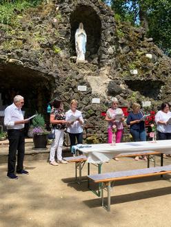 Wir danken Pfr. Jung für die feierliche Andacht an der Grotte in Rückers am 16. Juli und allen, die sich hierbei engagiert haben. Bitte helfen Sie mir Ihrer Spende, die geplante Renovierung der Mariengrotte zu ermöglich und umzusetzen. Spenden sind möglich auf das Konto der Pfarrei Christkönig, DE75 5306 2035 0002 1002 07, Spendenbescheinigungen werden auf Wunsch gerne ausgestellt.