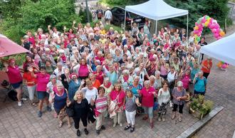 Am Zielpunkt Kloster Hünfeld wurden die Teilnehmerinnen mit einem Cocktail (natürlich in der Verbandsfarbe pink) begrüßt, bevor es nach Kaffee und Kuchen zum Gottesdienst in die Klosterkirche ging. Zelebrant Pater Steegmann und unsere Geistliche Begleiterin und Predigerin Patricia Kraus betonten den Gemeinschaftsaspekt des Evangeliums von der wunderbaren Brotvermehrung. Die Songgruppe Lehnerz begeisterte mit mitreißenden aus der Schlagerwelt bekannten Melodien, die liturgisch getextet waren.