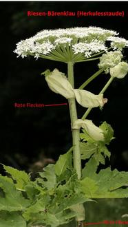 Da ist zunächst der Wiesen-Bärenklau, der seinem „großen Bruder“ in Blütenstand und Blattform ähnlich ist und eine Wuchshöhe von 150 cm erreichen kann. Damit ist er deutlich kleiner als die Herkulessstaude, die 250 bis 350 cm erreicht. Es gibt aber noch ein weiteres optisches Merkmal. Der Stängel des Riesen-Bärenklau weißt rote Flecken auf, die ihn manchmal sogar rot erscheinen lassen. Der Stängel des Wiesen-Bärenklau hingegen ist vollständig grün.