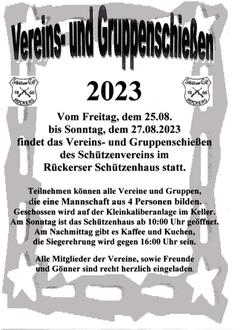Der Schützenclub 66 richtet in diesem Jahr endlich wieder das Vereins- und Gruppenschießen aus. Termin ist vom 25. - 27. August. Geschossen wird im Keller mit dem Kleinkalibergewehr auf 50 Meter liegend aufgelegt. Am Sonntag findet ummittelbar nach der letzten Runde die Siegerehrung statt. Ansprechpartner ist Andreas Lotz, Mobil 0171/5018181 oder per Mail (mail@andreas-lotz.de). Anmeldungen sind am Sonntag 27.08. noch kurzfristig möglich, wenn dann noch Termine frei sind.