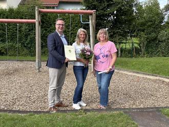 Die Erzieherin Esther Ströer (mitte) kann auf 25 Dienstjahre im öffentlichen Dienst zurückblicken. Fliedens Bürgermeister Christopher Gärtner sowie Kita-Leitung Jennifer Heil gratulieren ihr herzlich.