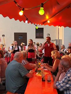 Nach einer dreiwöchigen Sommerpause waren alle Musikerinnen und Musiker voller Vorfreude auf den Auftritt am Samstag, den 19. August 2023 in Hilders. Im gemütlichen Ambiente des „Handwerkerhofes“ spielten wir von 19.30 Uhr bis 22.45 Uhr auf dem Bier- und Weinfest der einheimischen Trachtenkapelle. Das glänzend aufgelegte Orchester begeisterte mit abwechslungsreicher Blasmusik und sorgte für gute Laune unter den Festgästen. Ihre Premiere als Sängerin feierte an diesem Abend unsere Klarinettistin Stephanie Weß.