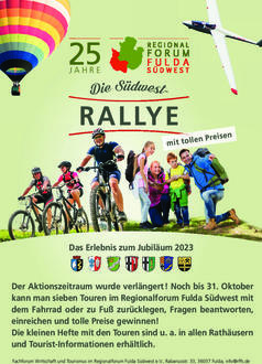 Wir möchten das Regionalforum und unsere Heimat mit Ihnen hochleben lassen und tun das mit ganz besonderen Erlebnissen. Wir laden Sie ein, Fulda Südwest noch einmal aus einer neuen Perspektive kennenzulernen. Die sieben Mitgliedsgemeinden haben sich dafür jeweils eine Route ausgedacht und laden Sie ein, diese zu Fuß oder mit dem Rad zu erkunden. Zu jeder Strecke stellt sich Ihnen eine spannende Frage oder eine kleine Aufgabe. Wer die Aufgaben löst und alle sieben Fragen richtig beantwortet, kann an einem spannenden Gewinnspiel teilnehmen und einen von zehn tollen Preisen wie beispielweise einen atemberaubenden Heißluftballonrundflug über die Region, einen Gutschein für einen erholsamen Wellness-Aufenthalt, einen Motorseglerflug auf der Wasserkuppe oder eines von vielen weiteren Erlebnissen gewinnen.