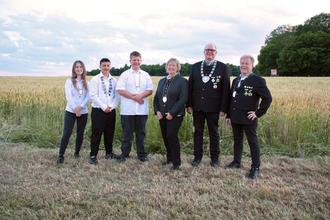von links: erste Jugendritterin Lisa-Marie Schöppner, Jugendkönig Erik Sämann, zweiter Jugendritter Luan Becker, erste Ritterin Elke Fender, Schützenkönig Christian Scheich, zweiter Ritter Matthias Buchmann