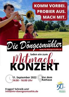 Am Sonntag, den 11. September 2022 laden die Döngesmühler zu einem Mitmachkonzert im Rahmen des Jubiläumstages in Flieden ein. An diesem Tag feiert die Großgemeinde ihr 50-jähriges Bestehen. Groß und Klein können dann hautnah miterleben, wie es ist, Teil der Döngesmühler zu sein. In diesem Zusammenhang dürfen sich die Besucher unter die Musiker und Musikerinnen mischen. Zusätzlich wird es weitere Mitmachangebote während des Auftritts geben. Wir freuen uns auf Dein/Euer Kommen!