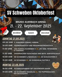 Der Sonntag beginnt um 9:00 Uhr mit der Heiligen Messe für lebende und verstorbene Mitglieder des SV Schweben. Ab 9:30 Uhr und 11:00 Uhr starten die F- und C-Junioren mit ihren Fußballspielen. Das Oktoberfest mit dem Fassbieranstich und einem zünftigen Frühschoppen mit Weißwurstfrühstück beginnt um 10:00 Uhr. Ein Mittagstisch mit ofenfrischem Fleischkäse und original bayerischem Kartoffelsalat wird ab 11:30 Uhr angeboten. Den sportlichen Teil des Tages eröffnet um 13:00 Uhr unsere Reservespielgemeinschaft Schweben/Magdlos gegen die SG Schlüchtern II. Kaffee und Kuchen wird ab 14:00 Uhr serviert. Um 15:00 Uhr empfängt unsere Erste die Zweitvertretung der SG Gundhelm/Hutten zum sportlichen Höhepunkt des Tages. Nach dem Spiel sind alle Zuschauer zu einer gemütlichen Sportlerrunde mit süffigem „Bayrisch Hell“ eingeladen.