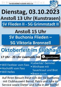 Am Dienstag, 03.10.2023 laden wir herzlich zum traditionellen Oktoberfest im Buchonen-Clubhaus ein. Nach den Fußballspielen der 2. Mannschaft gegen die SG Grimmstadt 2 um 13 Uhr und der 1. Mannschaft gegen die SG Viktoria Bronnzell um 15 Uhr bieten wir Ihnen ab 17 Uhr bei freiem Eintritt tolle Livemusik und super Stimmung mit dem Duo KUPPENSTÜRMER.