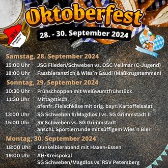 Das Fest startet am Samstag, 28. September mit dem Fassbieranstich nach dem C-Junioren Verbandsligaspiel JSG Flieden/Schweben gegen den OSC Vellmar. Ab 18:00 Uhr beginnt dann die Gaudi mit Maßkrugstemmen und Oktoberfestmusik.