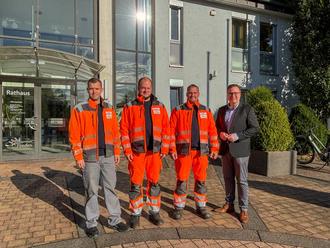 Bauhofleiter Jürgen Weider (links) und Bürgermeister Christopher Gärtner (rechts) freuen sich über die zwei neuen Mitarbeiter Winfried Schmitt und David Möser am gemeindlichen Bauhof.