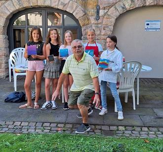Roland Mertz erklärte den Kindern wo es bei der Malerei ankommt, wo setze ich das Licht bei einem Objekt hin und wo setze ich den Schatten. Mit der Couachefarbe wurde als erstes geübt.