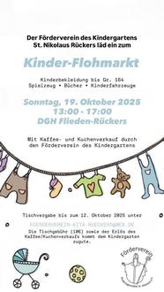 Der Förderverein des Kindergartens St. Nikolaus in Rückers läd ein zum Kinder-Flohmarkt am 19. Oktober 2025. Tischvergabe bis zum 12.Oktober per e-Mail unter foerderverein-kita-rueckers@web.de möglich.