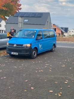 Das hr-Team ist am Drehtag mit zwei Bussen samt Drohne im Dorf unterwegs.