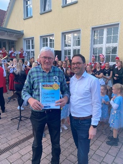 Zur Erinnerung gab es vom hr-Team eine Urkunde. Bürgermeister Christian Henkel gratulierte dem Ortsteil Döngesmühle.