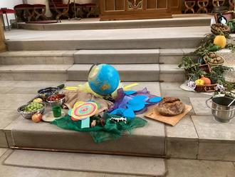 Ein besonderer Moment war, als die Vorschulkinder ein selbstgestaltetes Bild in der Mitte des Altarraums auslegten. Es zeigte, was ihnen am Erntedankfest besonders wichtig ist. Im Anschluss wurden alle mitgebrachten Erntegaben feierlich gesegnet.