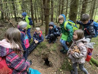 Am heutigen Tag in der Draußenschule konnten die Kinder dank Opa Manni etwas über die Vielfalt des Lebens und den Kreislauf der Natur erfahren. Mit Jagdhund Bomber ging es quer durch den Wald. Die Kinder lauschten den Geschichten von Opa Manni und bekamen einen wunderbaren ersten Überblick über die Tiere, Bäume und Beeren. Nach einem gemeinsamen Frühstück ging es dann gestärkt weiter, um einen Fuchs- und Dachsbau zu entdecken. Die Kinder kamen aus dem Staunen nicht mehr heraus und waren sich sehr sicher, dass ihnen aus den unterirdischen Gängen Fuchsaugen entgegen gefunkelt haben. Als krönenden Abschluss setzte Opa Manni noch zwei Schüsse für die Kinder ab. Vielen Dank für einen unvergesslichen Tag in der Draußenschule.