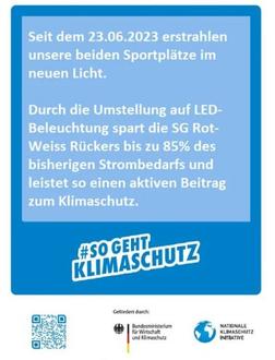 Bundesministerium für Wirtschaft und Klimaschutz (Projektträger: Zukunft - Umwelt - Gesellschaft (ZUG) gGmbH) aufgrund eines Beschlusses des Deutschen Bundestages, dem Hessischen Ministerium des Innern und für Sport, dem Landkreis Fulda und der Gemeinde Flieden. Laut Herstellerangaben sollen sich die Stromkosten durch die neuen LED-Strahler um bis zu 85 % verringern. Das spart nicht nur Geld, sondern es ist eine Verbesserung von Umwelt-, Natur- und Klimaschutz zur Senkung der Treibhausgasimmissionen sowie eine geringere Lichtemission. Unsere Fußballerinnen und Fußballer werden mit der neuen Flutlichtanlage sicher viel Spaß sowohl beim Training, als auch bei Spielen haben.