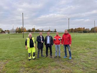 Stefan Ochs und Hubert Leibold von der SG Rückers sowie Lucas Schäfer von der Gemeinde Flieden und Bürgermeister Christopher Gärtner freuen sich über eine zügige Lösung mit der Rhön Energie (von rechts nach links).