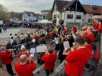 In Flieden ist es seit langem gutem Brauch, dass wir am Kirmessonntag die Kirmes im Königreich musikalisch umrahmen. In diesem Jahr marschierten „Die Döngesmühler“ wieder gemeinsam mit der Kirmestanzgruppe von der Pfarrkirche zum Dorfplatz. Dort spielte das Orchester zu Tänzen der Kirmespaare auf und unterhielt die Besucher in den Pausen mit schwungvoller Blasmusik. „Die Vogelwiese“, mit den singenden Kirmespaaren war der krönende Abschluss einer gelungenen Veranstaltung.