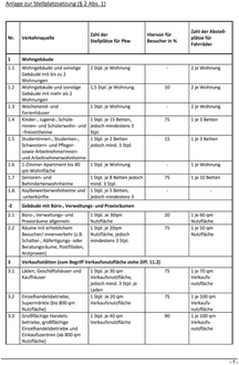 | (1) | Die Zahl der nach Abs. 1 herzustellenden Abstellplätze bemisst sich nach der dieser Satzung beigefügten Anlage, die verbindlicher Bestandteil dieser Satzung ist. Bei der Abstellplatzberechnung ist jeweils ab einem Wert der ersten Dezimalstelle ab fünf auf einen vollen Abstellplatz aufzurunden. |