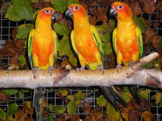 Diese Sonnensittiche (Aratinga solstitialis) freuen sich auf Ihren Besuch.