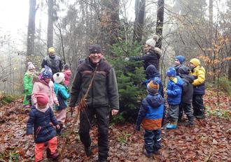 Doch nach langer Suche waren wir uns alle einig: wir haben den perfekten Weihnachtsbaum gefunden. Die Kinder waren voll bei der Sache und halfen tatkräftig Herrn Scherer beim Absägen unseres Fundstückes. Nachdem der Baum gefällt war, schnallte Herr Diegelmann das wunderschöne Exemplar auf unseren Bollerwagen.