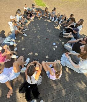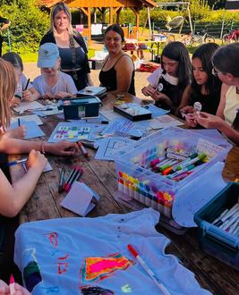 Der erste Tag der Ferien-Aktiv-Woche begann damit, dass sich die Kinder in 5 gleichgroße Gruppen aufteilen sollten. Anschließend fanden verschiedenen Kennenlernspiele, bei denen sich die Kinder im Alter zwischen sieben und zwölf Jahren spielerisch miteinander vertraut machten, statt. Jedes Kind durfte sich sein eigenes T-Shirt selbst gestalten.