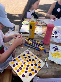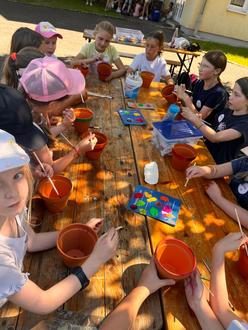 Am Donnerstag war ein großes Programm geplant. Am Vormittag wurden eigene Spiele entwickelt und dafür wurden Spielbretter selbst bemalt und gestaltet. Auch die Spielfiguren konnten aus lufttrocknender Modelliermasse geformt und gestaltet werden. Trotz besserem Wetter wurde auch in dieser Woche die Massenproduktion von Perlenarmbänder fortgesetzt. Die zweite Hälfte der Gruppe machte sich dann zur Mittagszeit auf zum Essen mit Besuch der Spielgolf-Anlage um dort ihr Können zu testen. Es wurden auch noch Blumentöpfe bemalt und mit Kresse bepflanzt. Außerdem wurde bei den Proben für die bevorstehende Talentshow noch der letzte Schliff gesetzt. Danach tobten und spielten alle Kinder noch ausgiebig und eine Wasserschlacht fand statt und wie in jedem Jahr waren alle nass, auch unsere Betreuer. Bei der Talentshow am Abend zeigten alle ihr Können. Ob singen, tanzen oder Akrobatik, es war für jeden etwas dabei und die Zuschauer staunten. Anlässlich der Talentshow wurde auch der Bürgermeister herausgefordert und musste sein Talent beweisen. Da dieser sehr musikalisch ist, brachte er sein Akkordeon mit und sang mit den Kindern das Kreuzberg-Lied. Nach der Talentshow stärkten sich alle mit Pizza. Um 19:00 Uhr gingen alle müde nach Hause.