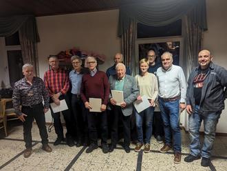 Von links nach rechts,O.Leitschuh 1.Vors.,N.Kullmann 50 Jahre, S.Diel 50 Jahre,A.Kullmann 60 Jahre, E.Kress 50 Jahre, H.Heurich 60 Jahre, A. Blum 25 Jahre, D.Krah 25 Jahre, V.Kremer 40 Jahre, S. Heurich 2.Vors.