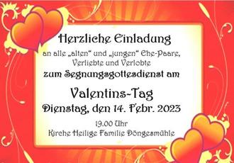 Am Valentinstag, Dienstag, den 14.02.2023 um 19.00 Uhr wird in der Kirche in Döngesmühle ein Gottesdienst mit Segnung der Paare und gefeiert.