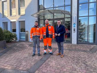 Wassermeister Steffen Meisel (links) und Bürgermeister Christopher Gärtner (rechts) begrüßen Fabian Bug (Mitte) als neuen Mitarbeiter im Wasserwerk.