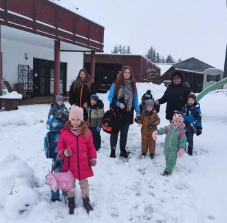 Zu Beginn des Ausflugs konnten sich die Kinder im verschneiten Laugendorf in der Gartenhütte erst einmal beim Frühstück stärken.