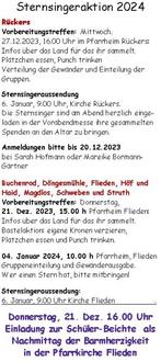 | Fl | 15.00 h Sternsinger-Treffen im Pfarrheim |