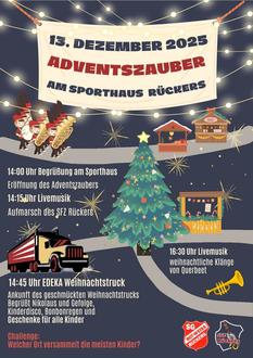 In diesem Jahr findet der alljährlich stattfindende SGR-Weihnachtsmarkt unter einem neuen Stern als Adventszauber statt. Gemeinsam mit dem Spielmannszug Rückers dreht sich die Veranstaltung rund um den Besuch des EDEKA Weihnachtstruck. Beginnen wird der Adventszauber um 14:00 Uhr mit leckeren Heißgetränken, Würstchen, Pommes sowie Kuchen und frische Waffeln. Um 14:30 Uhr wird die Veranstaltung mit dem ersten Highlight, dem Aufmarsch des Spielmannszuges, musikalisch eröffnet.