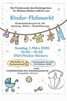 Der Förderverein des Kindergartens St. Nikolaus in Rückers lädt ein zum Kinder-Flohmarkt am 1. März 2026. Tischvergabe bis zum 22. Februar per e-Mail unter foerderverein-kita-rueckers@web.de möglich.