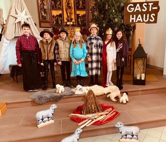 Borsch. Auch im Jahr 2022 führten die Erstkommunionkinder der Pfarrgemeinde "St. Maria Magdalena" in Borsch wieder das Krippenspiel auf. In tollen Kostümen und vor einem liebevoll gestalteten Bühnenbild spielten die sieben Kinder - teils mit Doppelrollen besetzt - die Geschichte über die Geburt Jesu nach. Die kleinen und großen Zuschauer der voll besetzten Borscher Kirche belohnten die Kinder für ihren gelungenen Auftritt im Anschluss mit einem kräftigen Applaus.
