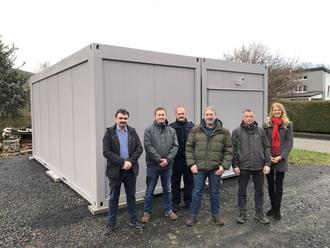 (v.l.n.r.) Bauhofleiter Rainer Wald, Wehrführer der FFW Geismar Tobias Goldbach, Stadtbrandmeister Jens Quentmeier, Ortsteilbürgermeister Danilo Schlapmann, Bauamtsleiter Bodo Kind und Bürgermeisterin Manuela Henkel vor den neu angeschafften Containern für die Feuerwehr Geismar
