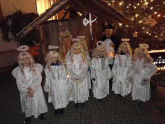 Die Engel bei der Licht-Illumination mit Nachtwächter Hubert Kritsch vor der Krippe auf dem Schlossplatz