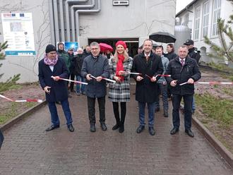 (v.l.n.r.) Staatssekretär Thorsten Weil, Landrat Reinhard Krebs und Landtagsabgeordneter Martin Henkel beim offiziellen Banddurchschnitt an der Heizzentrale beim Kulturhaus