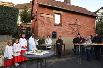 Ortsteilbürgermeisterin Sabine Volkmar und die Erste Beigeordnete Simone Kleinstück begrüßten die zahlreichen Gäste. Pfarrer Dr. Aloysius Ndiukwu segnete den neuen Ofen ein.