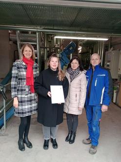 (v.l.n.r.) Bürgermeisterin Manuela Henkel, Klimaschutzmanagerin Manuela Trier, Stadtmitarbeiterin Carmen Henkel und Energiemanager Dominik Ebert an der Heizzentrale am Kulturhaus in Geisa