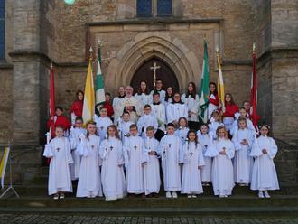 Kommunionkinder hintere Reihe v.l.n.r.: Niklas Malsch, Jonas Metschnabl, Jonas Schild, Colin Pascal Henkel, Naemi Günther, Antonia Hohmann, Leonie Völker, Emilia Grünberg, Leoni Rausch Vordere Reihe v.l.n.r.: Laura Knauf, Milena Jacob, Ana Emilia Mattke, Arno Henkel, Leo Trabert, Sean Mathis Siebert, Alisia Ebert, Laura Falkenhahn, Laura Kind
