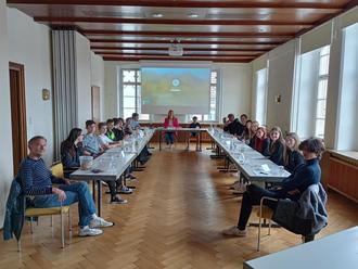 Die Schüler der Klasse 8b der Regelschule Geisa bei ihrem Besuch bei Bürgermeisterin Manuela Henkel im Rathaus mit Lehrer Bernd Hollenbach